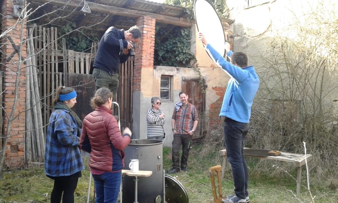 Der Grill wurde auf der Wiese vor dem Gasthof zusammengestellt und montiert. Die beiden Flugenten wurden am Tresen des Gastraumes vorbereitet und das Grillen fand an der zerfallenen Scheune hinter dem Haus statt. Dort wurde nach dem Grillen das angerichtete Festtagsmenü dann auch verspeist.