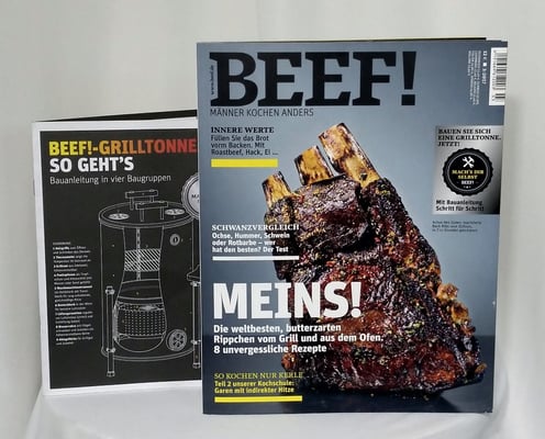 Im Rahmen des Chaos Camping Clubs bekamen wir vom BEEF!-Magazin den Auftrag, einen Fassgrill zu bauen. Der Bau unseres Ölfass-Smokers dauerte zwei Tage und wurde fotografisch dokumentiert. Die gesamte Story wurde im Beef!-Magazin Ausgabe 03/2017 auf 10 Seiten dargestellt.