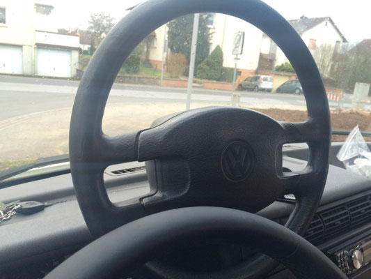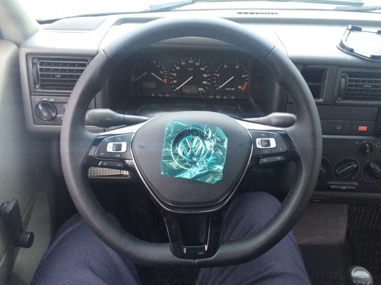 Meine größte Sorge war natürlich, durch den schon sehr gewagten Umbau die Zulassung und den Versicherungsschutz vom Fahrzeug zu gefährden. Also stattet ich dem TÜV einen Besuch ab und wollte das neue Lenkrad eintragen lassen. Die Aussage des TÜV-Prüfers: Das Lenkrad ist doch original VW, es hat den gleichen Durchmesser und ebenfalls keinen Airbag. Also ist technisch gesehen kein Unterschied zum alten Lenkrad und es müsse nicht eintragen werden. Also alles safe!