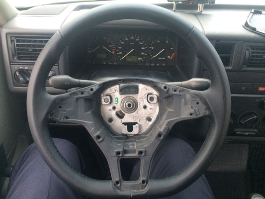 Mein alter T4 hatte ein völlig abgenutztes Lenkrad, das natürlich auch nicht über einen Airbag verfügte. Das gestaltete den Aus- und Umbau deutlich einfacher und brachte auch ein großes Maß an Rechtssicherheit. Da man ja nicht ohne weiteres mit Sprengmitteln hantieren darf und auch ein falscher Airbag im falschen Auto nicht funktioniert bzw. großen Schaden anrichten kann. Kein Airbag, kein Problem.