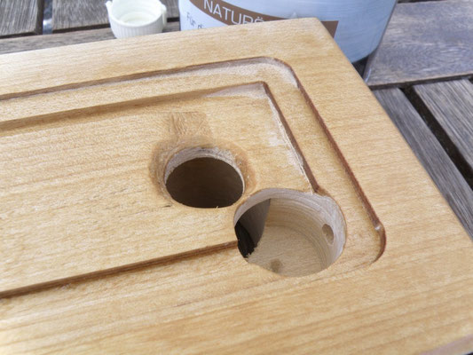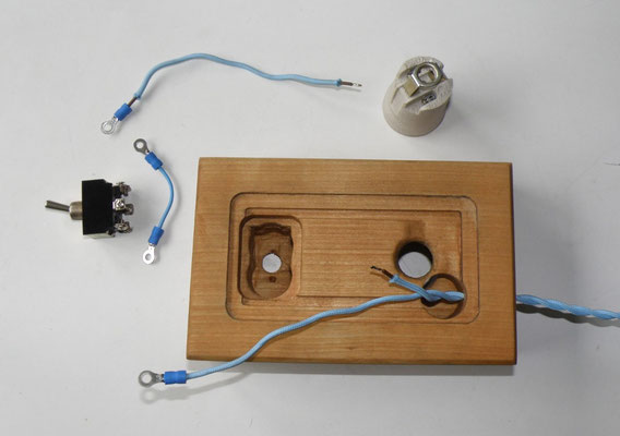 Als erstes richtiges Holz-Projekt erwies sich die Bearbeitung als schwierig. Es war einfach kein passendes Werkzeug vorhanden und so musste mit dem Forstnerbohrer improvisiert werden. Die Verkabelung von Schalter und Fassung sollte so erfolgen, dass sie von außen nicht ersichtlich ist. Die ganze Technik muss also in den Holzklotz integriert werden.