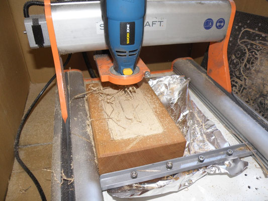 Mit dem Schwingschleifer die Oberfläche geglättet und die Kanten angefast. Mit der kleinen Stepcraft-CNC-Fräse wurde der Klotz anschließend bearbeitet.