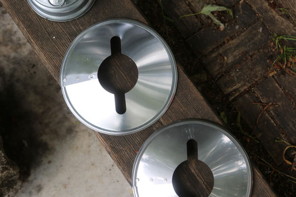 Als Rohmaterial dient Blech aus Edelstahl und Aluminium. Die nötige Kontur wurde präzise mit einem Industrielaser ausgeschnitten. Das Biegen und das Vernieten der Rohlinge erfolgt von Hand, hierbei ist viel Augenmaß und Fingerfertigkeit gefragt.