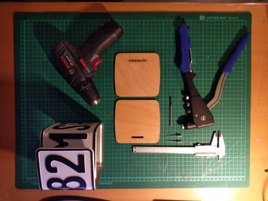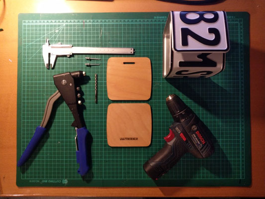 August 2015. Die ersten Exemplare der Nummernschildspardose bestanden aus je zwei Nummernschilder. Die beiden Seitenteile schnitt ich mit der Blechschere aus einem Nummernschild, welches Beschädigungen und Bohrlöcher haben konnte. Der Zuschnitt war relativ aufwändig und zeitintensiv. Die Seitenteile saßen sauber und formschlüssig in der Rille des umgebogenen Nummernschilds, nachdem es zusammengenietet wurde.