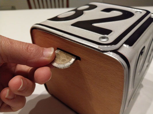 Mit der Zeit baute ich immer wieder Spardosen und verschenkte sie nicht nur an Freunde und Familienmitglieder sondern bot sie auch auf Ebay und Etsy zum Verkauf an. Immer wieder kam von meinen Kunden die Frage auf, wie man das Geld wieder aus der Spardose heraus bekommen kann. Die Spardose war mittels Blindnieten verschlossen - so half nur das Aufbohren der Nietverbindung. Alternativ könnte man eines der Seitenteile mit einem flachen Gegenstand (Messerklinge) aus seiner Fassung hebeln. Die Spardose kann anschließend aber nicht mehr so einfach wieder zusammen gebaut werden. Das war mir eigentlich egal, ein Sparschwein muss man ja auch zerschlagen, um an das mühsam angesparte Geld zu gelangen.