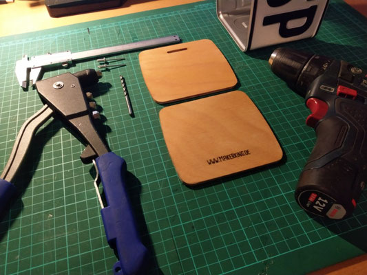 Eine erste große Verbesserung waren die Seitenteile aus Sperrholz. Dies lies sich schneller und präziser zuschneiden und verbesserte die Optik. Bis dahin war die Nummernschildspardose einfach eine geschlossene Blechdose. Nach den ersten Protoypen - die sich super als Geburtstags- und Weihnachtsgeschenke eigneten - lies ich die Seitenteile bei einem Freund aus Buchensperrholz laserschneiden. Das Holz wird beidseitig geölt, damit seine Oberfläche versiegelt ist und es sich nicht verzieht.