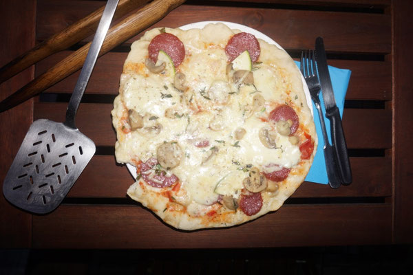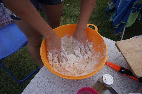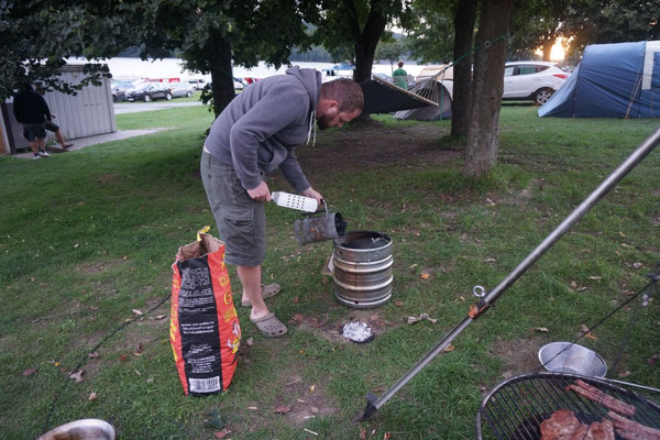 Auf dem Campingplatz wurde das Pizza-Keg offiziell eingeweiht. Die Mädels kneteten Teig, im Anzündkamin wurde Holzkohle zum Glühen gebracht und in den Brennraum des Fasses geleert. So backten wir den ganzen Abend Pizza und Flammkuchen. Und am nächsten Tag wiederholten wir das ganze.