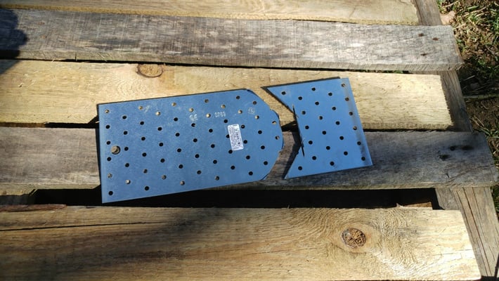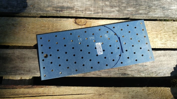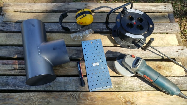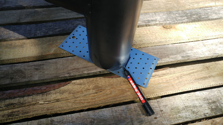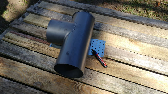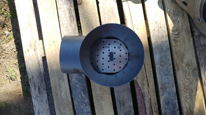 Bei den Holzbeschlägen fanden wir ein Lochblech, welches optimal in das Rohr passte und unserem Ofen als Brennrost dienen wird.
