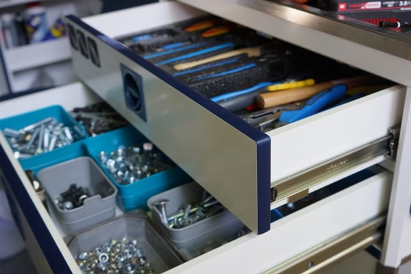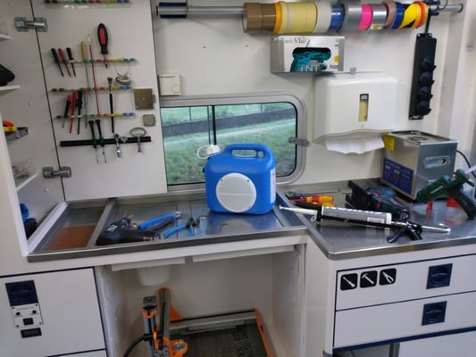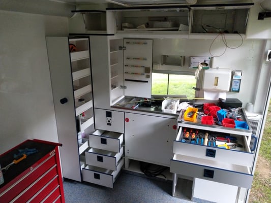 Der Kofferaufbau verfügt aus seinen ersten Leben als Lebensretter noch über jede Menge Staufächer, Schubladen und Ablagemöglichkeiten. Genug Platz für allerhand Werkzeug und Arbeitsmaterial. Die Innenwände wurden großzügig mit Lochplatten und Schubfächern versehen. So hat nun endlich jedes noch so spezielle Werkzeug seinen Platz und ich kann einfach, entspannt, schnell und ordentlich tüfteln und basteln.