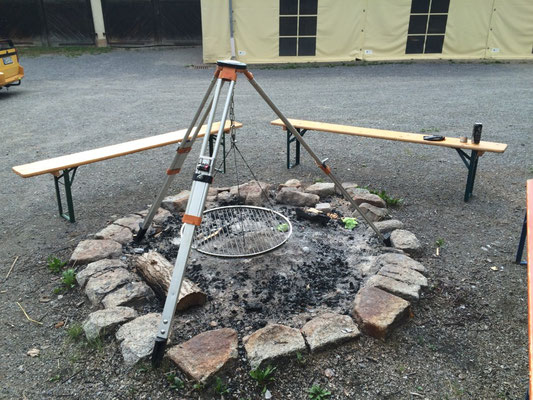 Für diesen Grill kommt ein Alu-Vermessungsstativ zum Einsatz, welches auf Baustellen verwendet wird. Vergleichbare Stative kosten auf dem Flohmarkt ab 20 Euro, neu gibt es ganz billige Versionen schon ab 50 Euro.