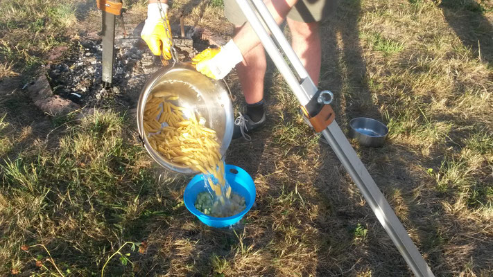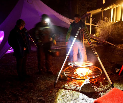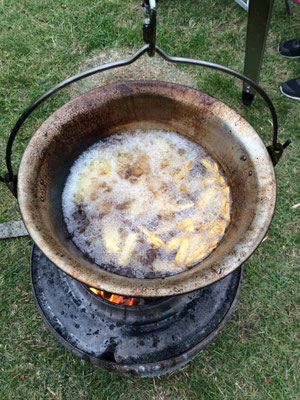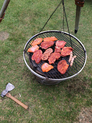 Auf dem großen Grillrost lässt sich eine ganze Großfamilie versorgen. Und hängt man einen Kessel an die Kette, so kann man darin über dem offenen Feuer Nudeln kochen, Waschwasser erhitzen oder im kochenden Fett unsere legendären Feuerpommes zubereiten.