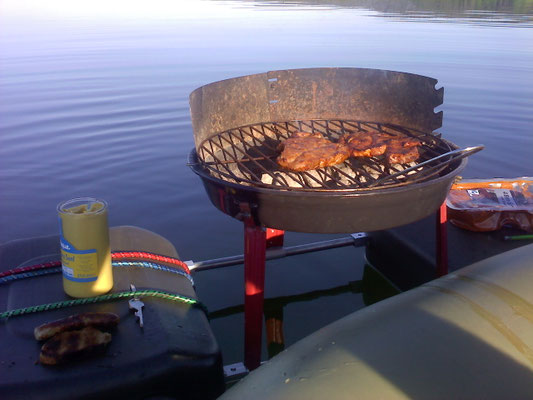 Leider hat der nautische Grillspaß auch eine Schattenseite: Mehr als 3 Personen passen nicht in mein Schlauchboot. Aber dafür ist dieser Grill auf jedem See ein Hingucker und zieht neidische Blicke auf sich. Das Fleisch schmeckt trotz beengter Raumsituation im Boot viel besser als an Land. Das muss man einfach mal probiert haben!