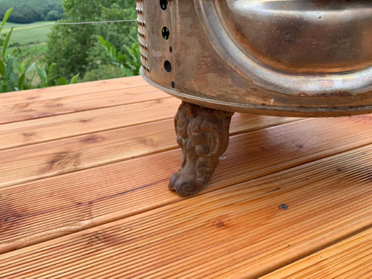 Auch viele Jahre nach dem Bau macht der Terrassenofen ein gutes Bild und funktioniert ohne Einschränkungen. Die Waschtrommel ist natürlich aus Edelstahl, hitzebeständig und absolut Wetterfest. Die schweren Füße aus Gusseisen werden auch in den nächsten Jahrzehnten nicht wegkorridieren. So kann man wirklich behaupten, dass dieser Ofen für die Ewigkeit gemacht ist.