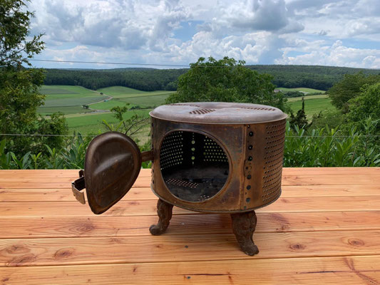 Benutzt wurde für dieses kleine Projekt wie immer nur, was sowieso vorhanden war. Die Waschmaschinentrommel stammt vom Schrott und eignete sich leider nicht als Lagerfeuerkorb - weil die Öffnung nicht zentral sondern seitlich angebracht ist. Bei der Waschmaschinentrommel handelt sich nämlich um einen Exoten, sie stammt von einer platzsparenden Toploader-Waschmaschine. Die Füße aus Gusseisen stammen von einen alten Werkstattofen, der schon viele Jahre zuvor entsorgt wurde.
