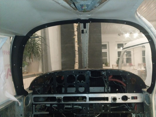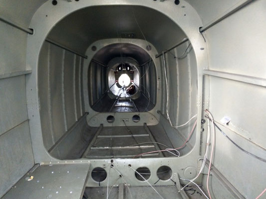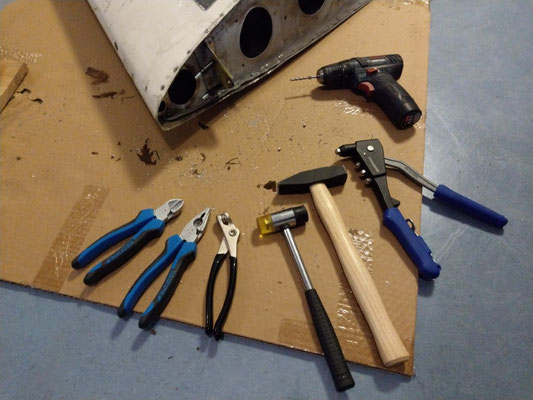 Der gut 200kg schwere und 5,5 Meter lange Rumpf musste halbiert werden, damit wir ihn durch die Küche in das Wohnzimmer des Hauses transportieren konnten. Hierfür wurde eine Reihe Nieten aufgebohrt, wobei das Entfernen der circa 100 Nieten mehrere Stunden Arbeit und eine Hand voll Bohrer kostete.