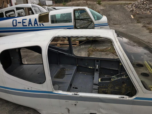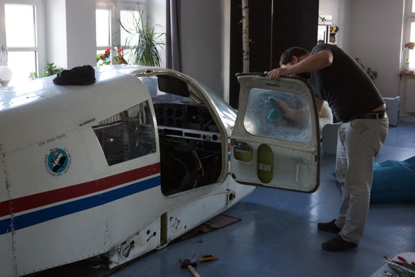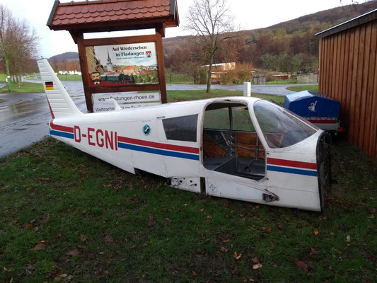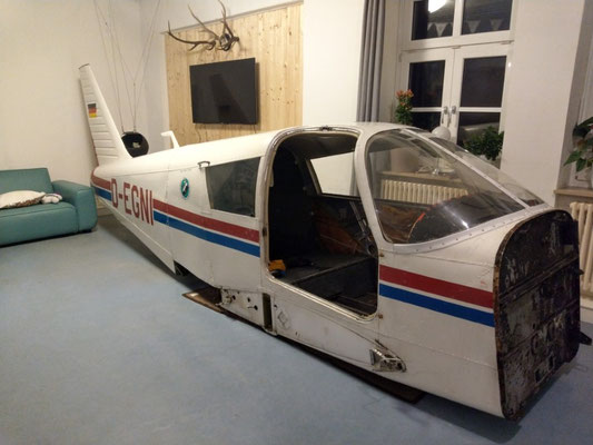 Wir entschieden uns dazu, einen vollständigen und weitgehend intakten Rumpf einer Piper PA 28 zu kaufen. Dazu der passende rechte Flügel und eine Türe.