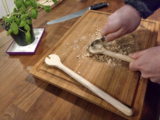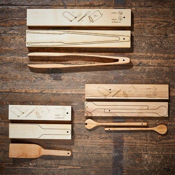 Die Produktlinie umfasst drei Quader aus Eschenholz, aus denen entweder eine Grillzange, ein Salatbesteck oder ein zweckmäßiger Pfannenwender geschnitzt werden können.