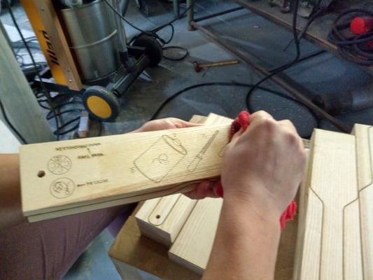 Das Holz haben wir in Teamarbeit zugeschnitten, gehobelt, entgratet, gelasert, gebohrt. Die Oberflächen wurden mit Leinölfirnis versiegelt.